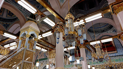 Tonight we visited the Rawdah, the Garden of Heaven. Rawdah is a tiny spot at Masjid Nabawi where all your prayers and doa will be heard and granted. The Rawdah's borders from the eastern side was the house of Aishah, the pulpit from its western side, the qiblat from its southern side, and a parallel line to the end of Aishah's house from the northern side. There are six pillars or columns inside the Rawdah area within Masjid Nabawi that hold special historical and spiritual significance, with a further two inside the Sacred Chamber. These blessed pillars stand on the exact locations where the original pillars, made from palm tree trunks, stood after Masjid Nabawi was built during the life of the Prophet Muhamad. The Rawdah area is distinguished by its green carpet.